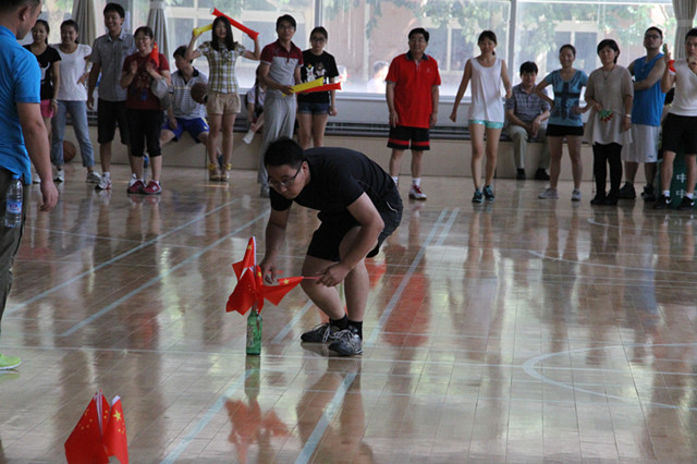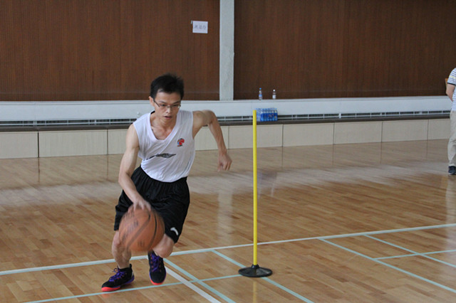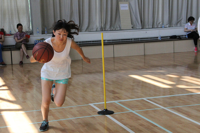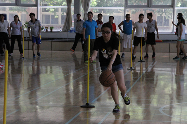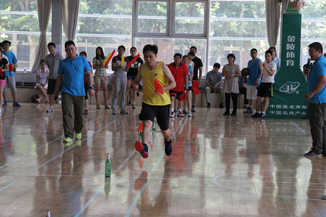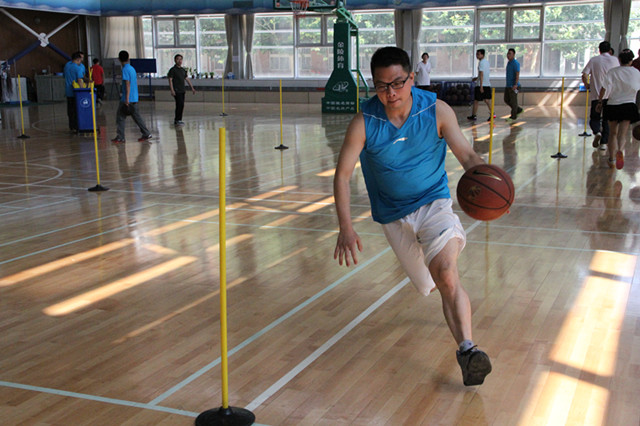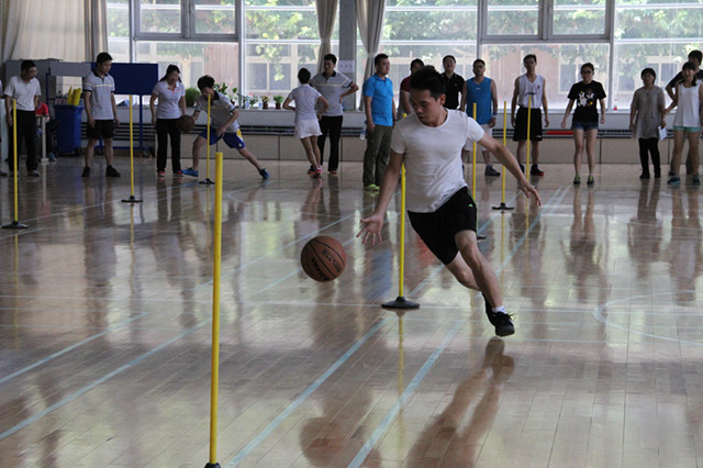 在接下来的运球绕杆跑比拼中要求运动员运球路线为绕过场内标志杆,S型路线前行,到达终点用时最少者为优胜者。第一棒派出了球感好、速度快、发挥稳健的胡钊铭,虽然一棒过后稍有落后,但随后渐入佳境,越战越勇。马君丽、卓慧、周铁兵的稳定发挥,把其他队远远抛在身后。最后一棒周阳以迅雷不及掩耳之势运球绕杆,一骑绝尘,锁定冠军。这次趣味竞赛让我们看到那些平日伏案工作的同志们个个变成身手敏捷、健步如飞的运动健将,他们绕杆速度如飞,犹如“平地漂移”,出色的表现激起了全场阵阵掌声和喝彩声。