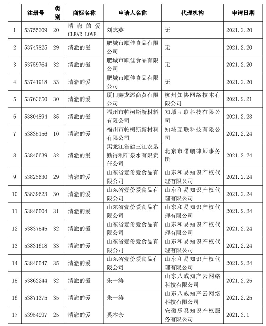 2021年2月19日,中央军委为戍边烈士陈祥榕追记一等功。“清澈的爱,只为中国”是陈祥榕烈士生前写下的战斗口号,充分彰显新时代英烈对祖国的热爱和无私奉献的高尚情操。2月20日以来,“清澈的爱”被个别企业和自然人当做商标向国家知识产权局商标局提交了注册申请,图谋不当利益,代理机构提供不法服务,亵渎了英烈的精神,背离了社会主义核心价值观,极易产生恶劣的社会影响。对此,国家知识产权局予以谴责,并依据商标法第十条第一款第八项“有害于社会主义道德风尚或者有其他不良影响的”的规定,快速果断地对第53747825号“清澈的爱”等17件商标注册申请作出驳回决定。现予以公布。